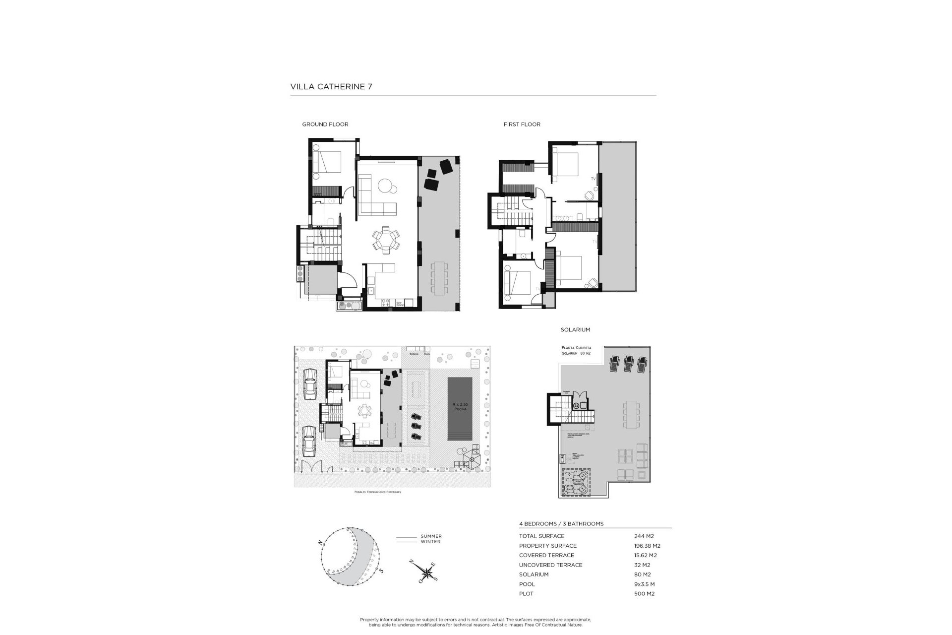 El exterior de estas viviendas es un verdadero oasis de relajación. Cada propiedad cuenta con un jardín privado, perfecto para disfrutar del clima mediterráneo. La presencia de una piscina privada añade un toque de lujo, permitiendo refrescarse en los días más cálidos. Además, las terrazas y el solárium ofrecen espacios adicionales para el ocio al aire libre, ideales para reuniones familiares o simplemente para disfrutar de un momento de tranquilidad. La pérgola proporciona sombra y un lugar acogedor para descansar durante las horas de sol intenso.