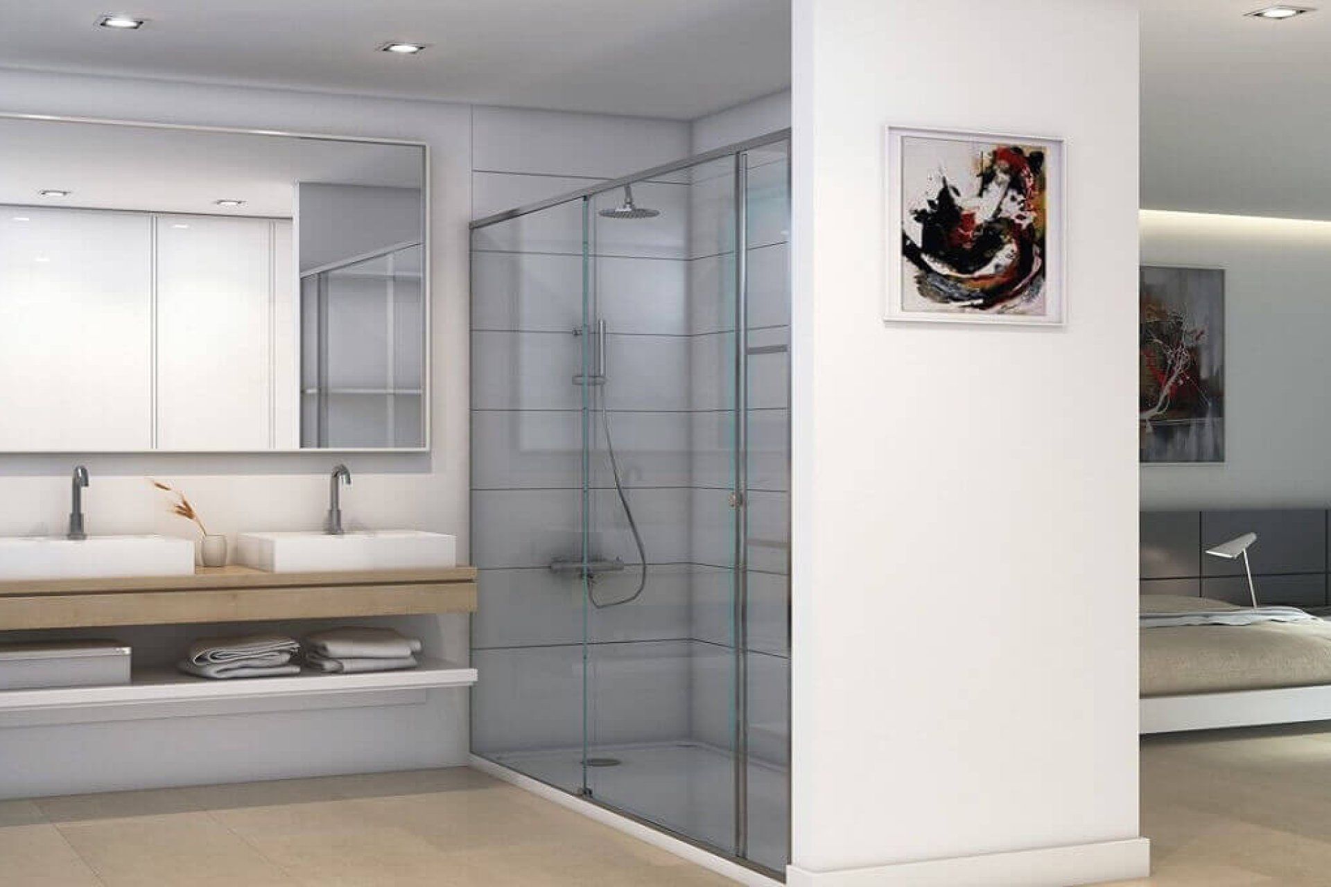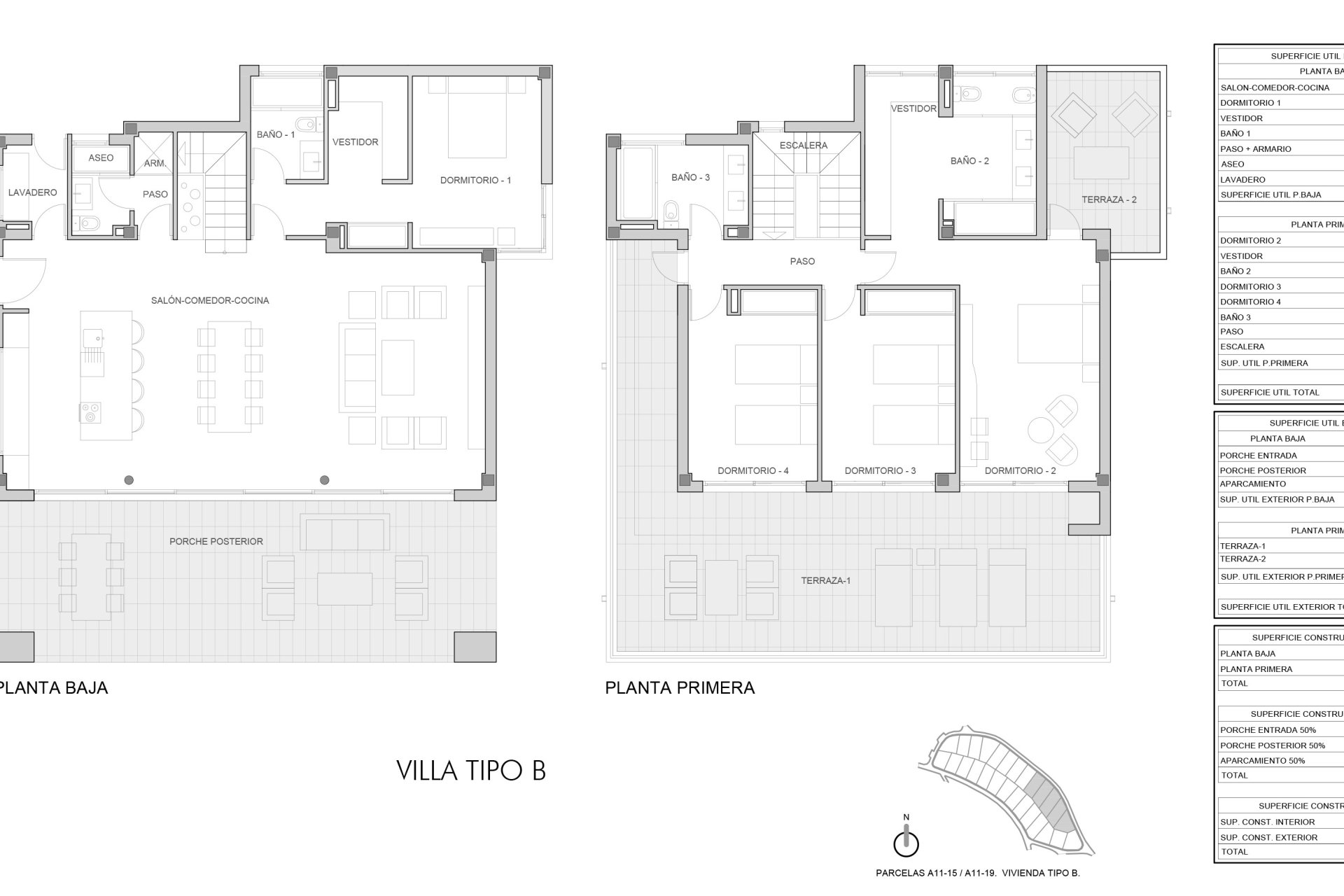 El interior de estas villas en Manilva está diseñado con un enfoque en el lujo y la funcionalidad. Con cuatro dormitorios y cuatro baños, cada villa ofrece un espacio amplio y cómodo para toda la familia. Los suelos de gres porcelánico aportan un toque de elegancia y son fáciles de mantener. La tecnología moderna está presente en cada rincón, con sistemas de domótica que facilitan el control del hogar, y un videoportero que añade un nivel extra de seguridad. Las cocinas están equipadas con electrodomésticos de alta calidad, y los armarios empotrados en los dormitorios ofrecen un almacenamiento eficiente y discreto.