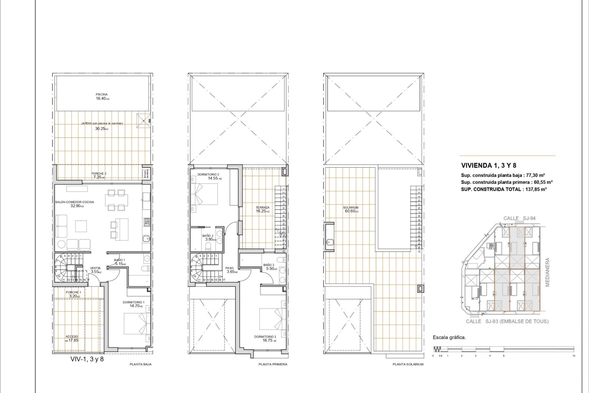 Los exteriores de estos adosados han sido cuidadosamente diseñados para ofrecer un espacio de relajación y ocio. Cada propiedad cuenta con una piscina privada, ideal para disfrutar de los días soleados en la privacidad de tu hogar. Además, las terrazas proporcionan un espacio adicional al aire libre donde se puede disfrutar de las vistas al mar y del clima mediterráneo. El solárium es otro de los atractivos de estas viviendas, ofreciendo un espacio perfecto para tomar el sol o disfrutar de una cena al aire libre con vistas panorámicas.