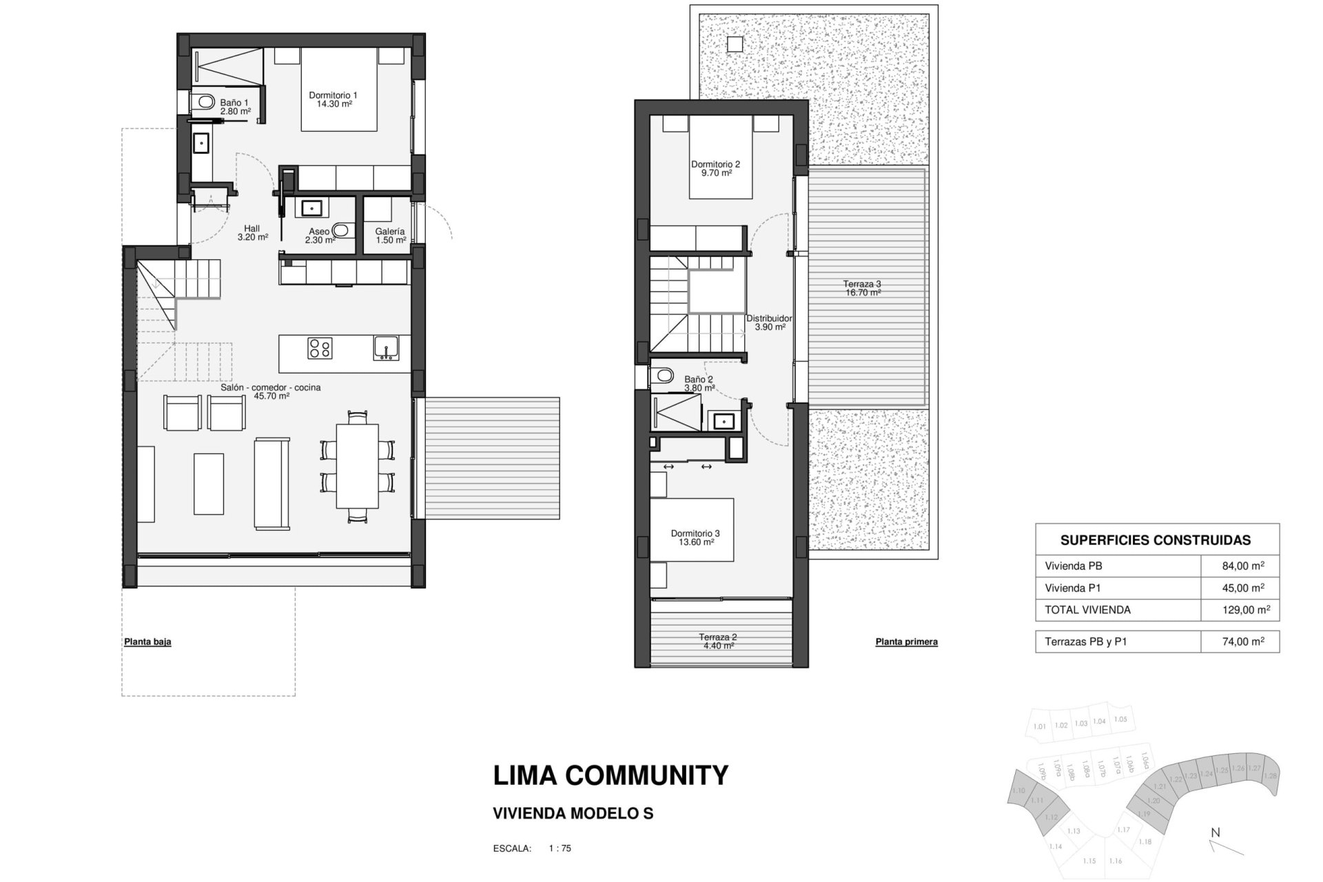 El interior de las viviendas está diseñado para ofrecer un ambiente acogedor y moderno. Cada propiedad cuenta con tres dormitorios y tres baños, proporcionando un espacio amplio y funcional para toda la familia. Los acabados de alta calidad incluyen suelos de gres porcelánico, que aportan un toque elegante y son fáciles de mantener. Las viviendas están completamente amuebladas y equipadas con electrodomésticos, asegurando que cada detalle esté cuidado para ofrecer el máximo confort. La tecnología también juega un papel importante, con características como domótica, aire acondicionado, calefacción por suelo radiante, videoportero y persianas eléctricas, que garantizan un estilo de vida moderno y eficiente. Los armarios empotrados ofrecen soluciones de almacenamiento prácticas y elegantes, completando un diseño interior que combina funcionalidad y estilo.