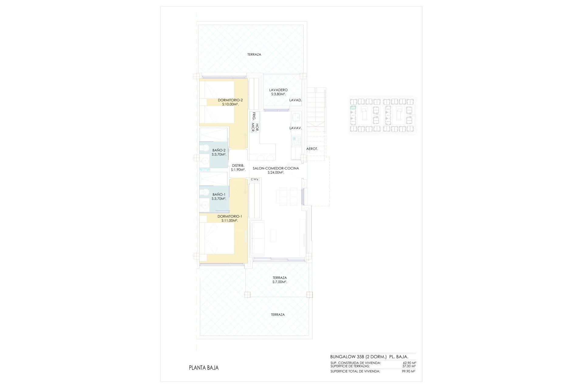 De buitenruimtes van deze eigendommen zijn ontworpen om optimaal te genieten van het mediterrane klimaat. Elke woning heeft een privéterras, ideaal om buiten te ontspannen. Bovendien beschikken de bungalows over een solarium, perfect om in de privacy van je eigen huis van de zon te genieten. De aanwezigheid van een pergola voegt een vleugje elegantie en functionaliteit toe, door schaduw en stijl te bieden. De gemeenschappelijke ruimtes omvatten goed onderhouden tuinen, die een groene en rustige omgeving bieden om te wandelen of te ontspannen.