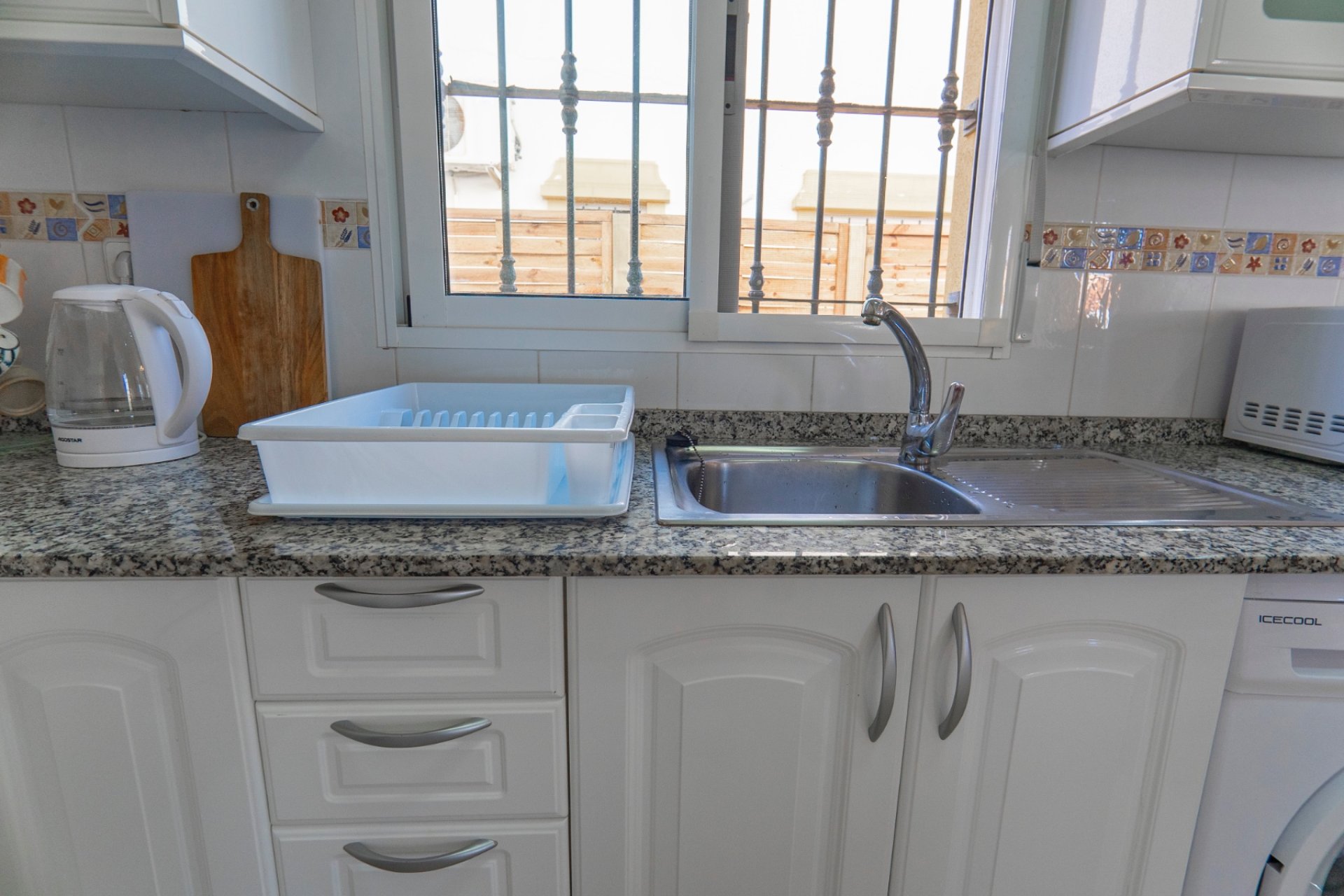 Buiten vindt u diverse zitjes om te genieten van de Spaanse zon, van een schaduwrijk terras tot een privé dakterras met veel bergruimte en vrij uitzicht. Met een buitenberging en parkeergelegenheid op de oprit komen functionaliteit en stijl samen. Deze woning is ideaal voor zowel permanente bewoning als een onderhoudsarme vakantiewoning .