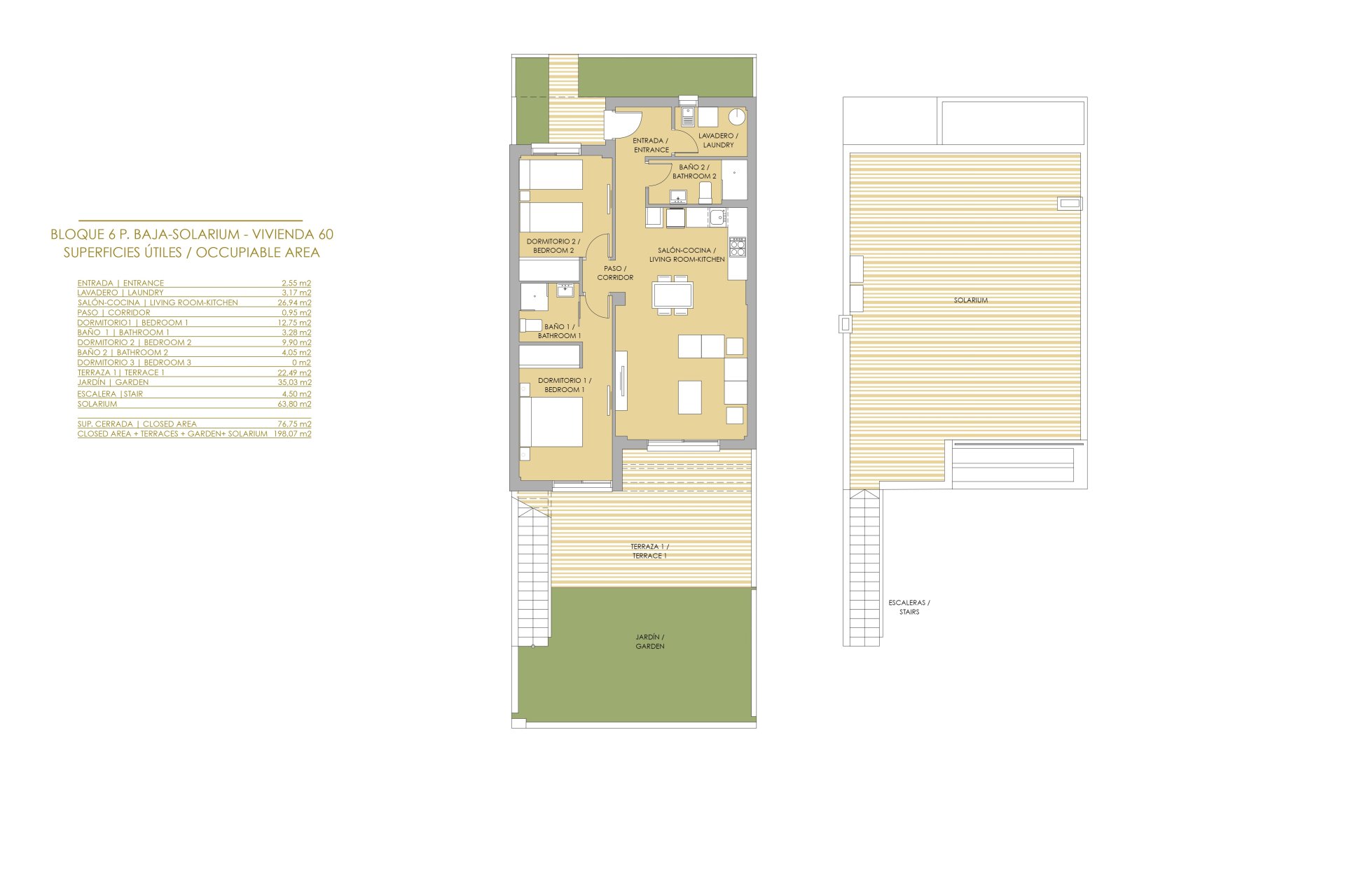 De buitenruimtes van deze woningen zijn ontworpen om optimaal te genieten van het mediterrane klimaat. Elke woning heeft een terras, ideaal om buiten te ontspannen of te genieten van maaltijden in de open lucht. Bovendien bevatten sommige typologieën een solarium, wat een extra ruimte biedt om te zonnebaden of een privé ontspanningsruimte te creëren. De tuinen, aanwezig in bepaalde configuraties, bieden een vleugje natuur en een perfecte ruimte voor buitenactiviteiten. De toevoeging van pergola's aan de buitenruimtes voegt een element van schaduw en stijl toe, waardoor het mogelijk is om zelfs op de zonnigste dagen van buiten te genieten.