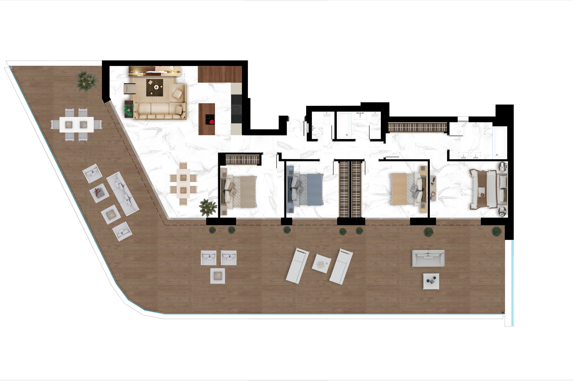 De buitenomgeving van dit residentiële complex in Marbella is ontworpen om de natuurlijke schoonheid van de regio aan te vullen. De eigendommen bieden privéterrassen, perfect om te genieten van het mediterrane klimaat en het zeezicht. De gemeenschappelijke tuinen bieden een groene ruimte waar bewoners kunnen ontspannen en van de natuur kunnen genieten. Bovendien is het gemeenschappelijke zwembad een ideale plek om af te koelen en te socializen tijdens de warme zomerdagen. De bevoorrechte locatie van het complex, op slechts 1 km van de zee, stelt bewoners in staat om op elk moment te genieten van strandwandelingen en watersportactiviteiten.