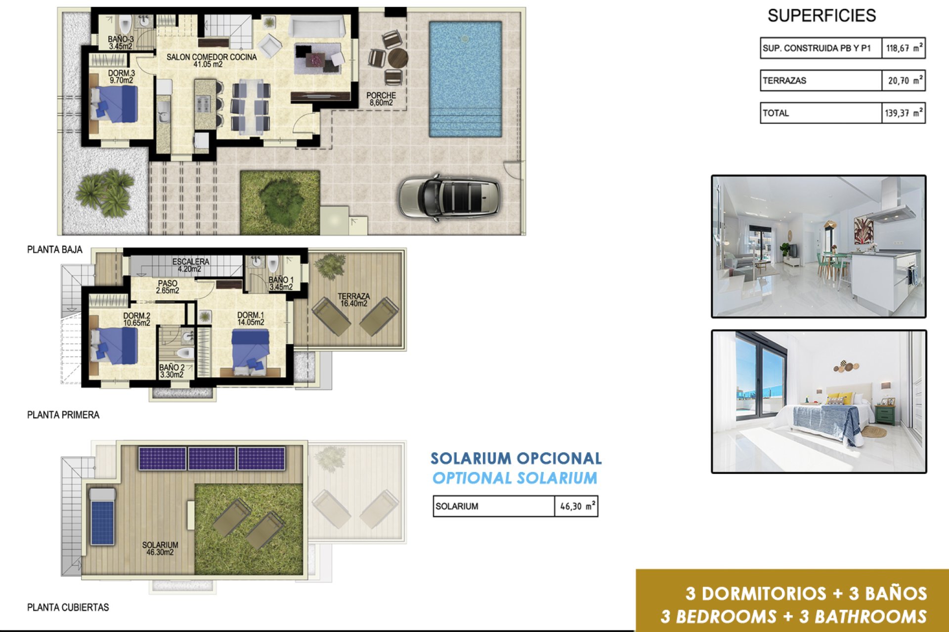 Located in the charming town of Orihuela, this residential complex offers 39 detached homes that stand out for their modern and functional design. These properties are designed for those seeking a home in a tranquil setting, yet with all amenities within reach. Proximity to a golf course, just 0.85 km away, adds an additional appeal for golf enthusiasts. The homes feature three bedrooms and three bathrooms, providing a spacious and comfortable space for the whole family. The option to choose an optional solarium allows residents to enjoy the Mediterranean climate to the fullest.