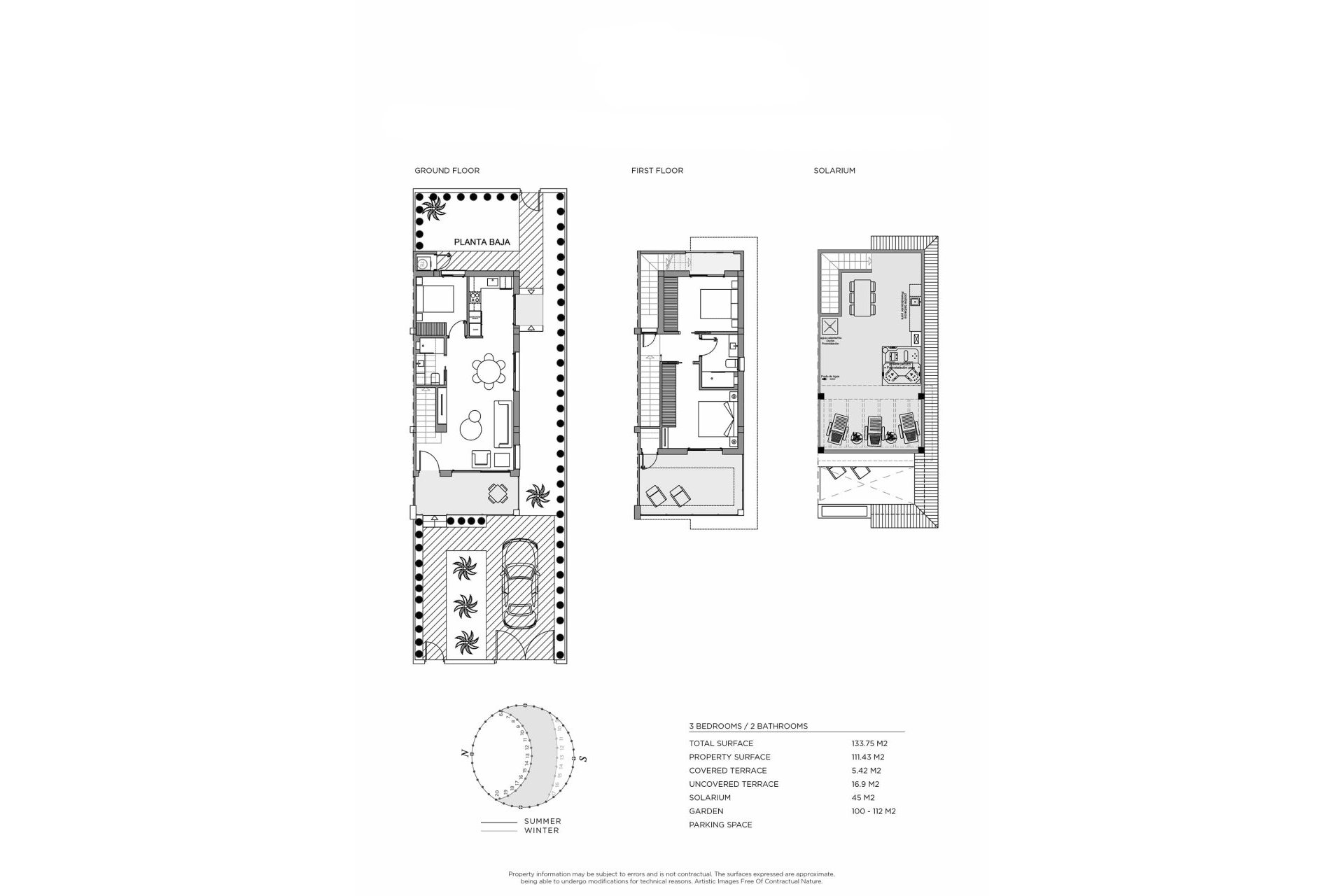 The exteriors of these homes have been designed to maximize enjoyment of the Mediterranean climate. Each property features a private garden, perfect for relaxing or enjoying outdoor activities. The presence of a private pool adds a touch of luxury, allowing for refreshing dips on the hottest days. Additionally, the homes have a terrace and a solarium, offering multiple spaces to relax or socialize outdoors. The inclusion of a pergola provides shade and style, creating a welcoming and elegant outdoor environment.